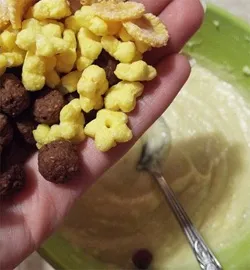Детский сухой завтрак - можно взять шарики, звездочки или хлопья - добавьте в тесто. Перемешайте. Духовку разогрейте до 180°C. Дно и стенки формочек смажьте сливочным маслом и выложить в форму тесто. Если вы печете в бумажных формочках, то их смазывать не обязательно. Ставьте формы в уже разогретую до 180°C духовку. Выпекайте 25 минут. Вот такой замечательный рецепт-детки с удовольствием завтракают кексиками-вкусняшками.