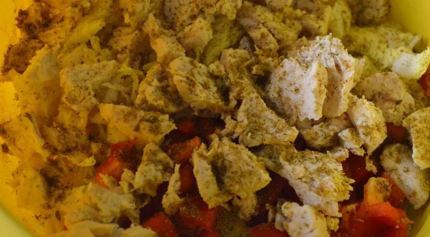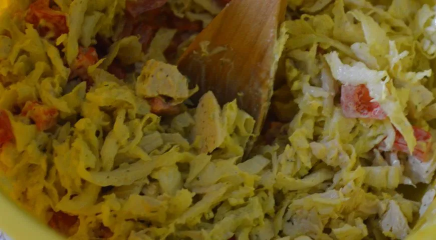 Добавить по вкусу специи для курицы, майонез. Перемешать , выложить в салатник.
