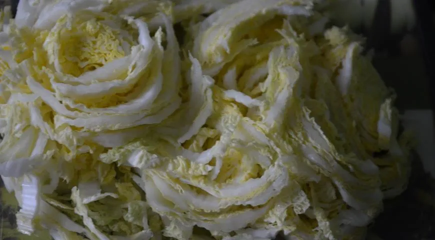 В миске соединить куриную грудку , помидор,болгарский перец , пекинскую капусту.