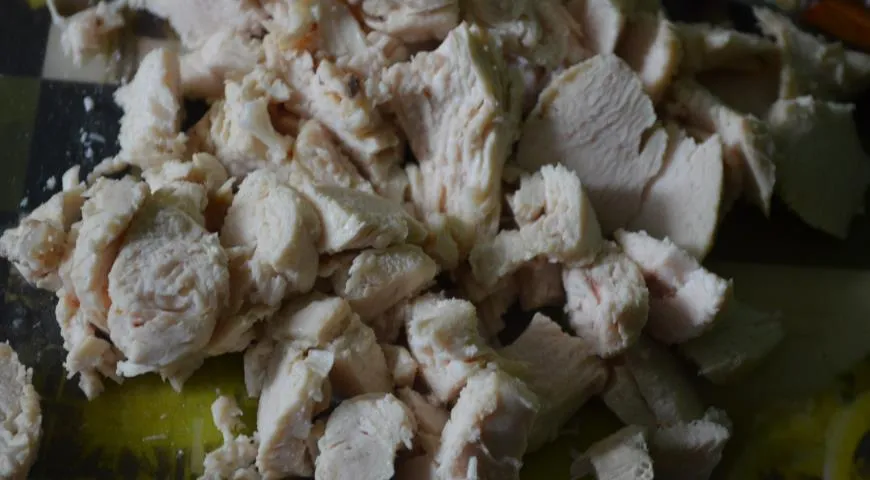 Куриную грудку отварить до готовности. Нарезать кубиками грудку, перец,пормидор.