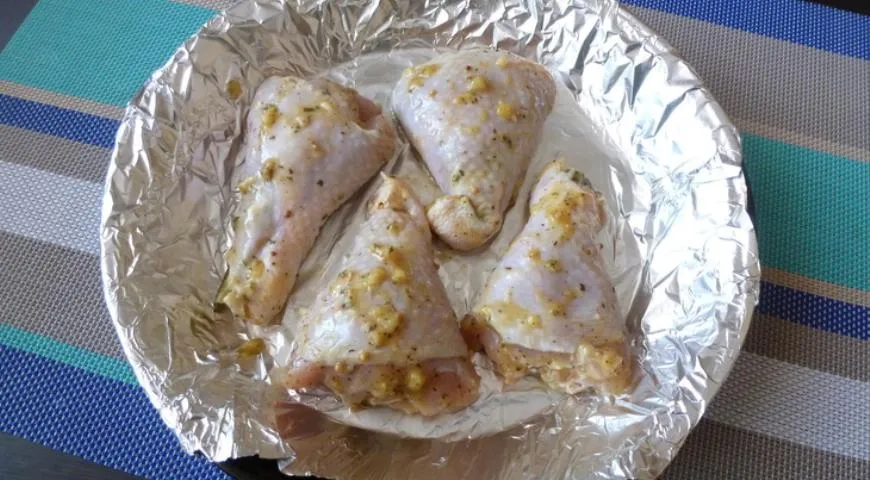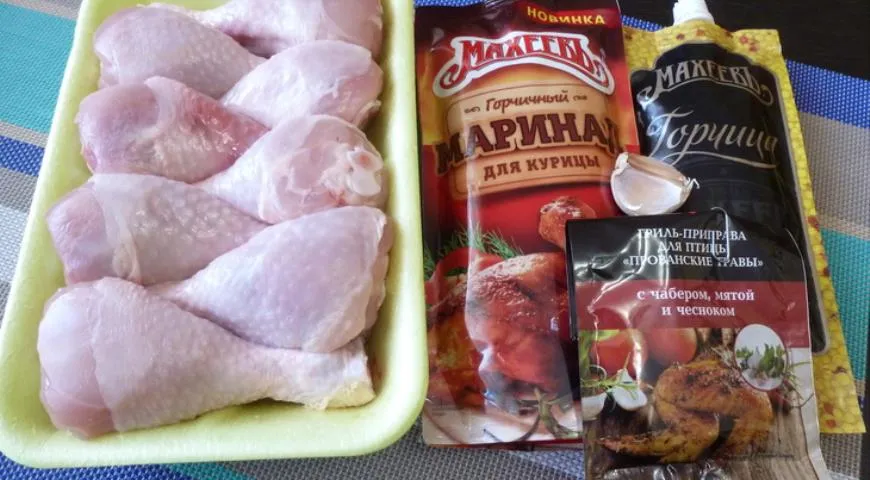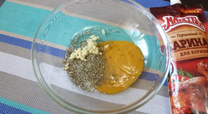 Приготовить маринад для куриных голеней из горчицы и маринада Горчичный для курицы ТМ Махеев, выдавленного через пресс чеснока и приправы-гриль.