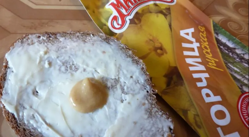 Нарезать черный хлеб на кусочки. Смазать кусок хлеба сливочным маслом и горчицей ТМ Махеев.