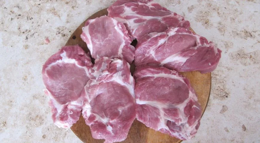 Свиную шейку разрезать на порционные стейки толщиной около 1 см, посолить, поперчить по вкусу.