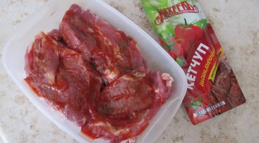 Репчатый лук измельчить в блендере, отжать сок через два слоя марли. Соединить сок с кетчупом шашлычный «МахеевЪ».