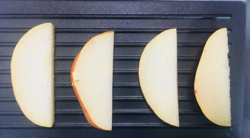 Сорт груши выбирайте тот, который Вы любите. Вымойте грушу и нарежьте на несколько долек. Готовим гриль-грушу, так же на сухой сковороде слегка поджариваем с двух сторон.