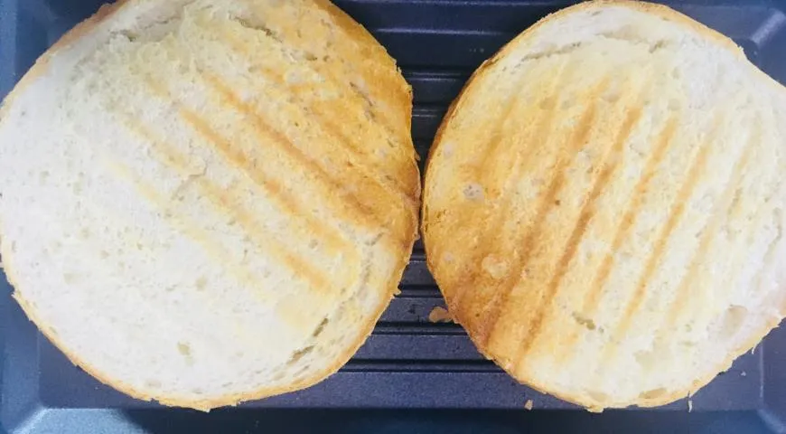 Булочку для гамбургера разрезаем вдоль. На сухой сковороде или гриль сковороде, мультипекаре подсушить две половины булочки.