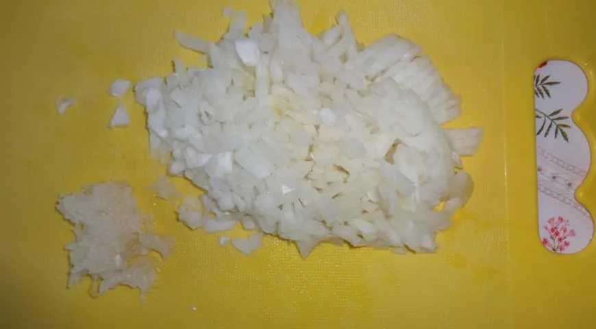Лук и чеснок очистить. Лук нарезать мелкими кубиками, чеснок натереть на мелкой тёрке.