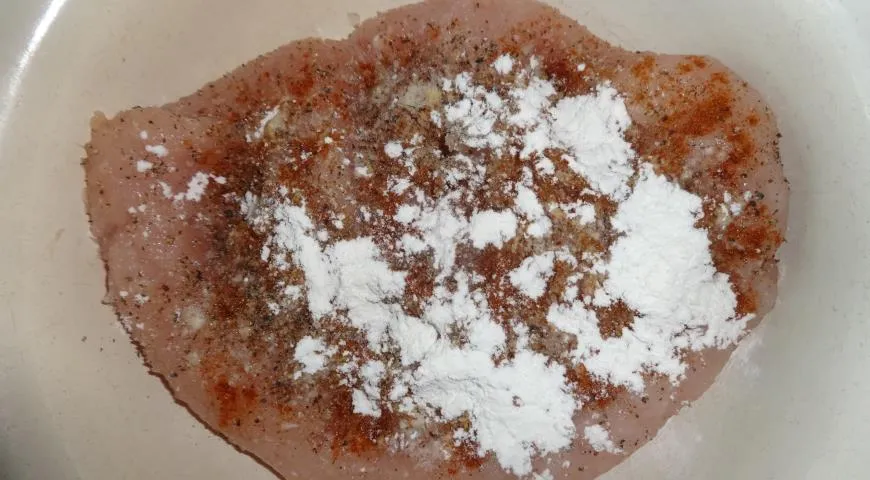 В куриный фарш добавить соль, перец, паприку, хмели-сунели. Посыпать крахмалом, перемешать до однородного состояния.