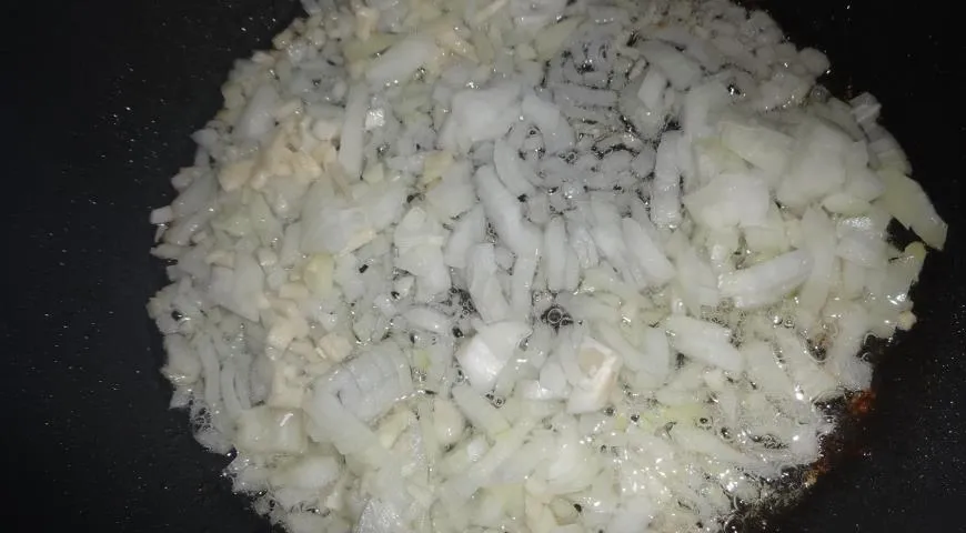 В сковороду с маслом высыпать лук и чеснок, обжарить в течение нескольких минут до золотистого цвета.