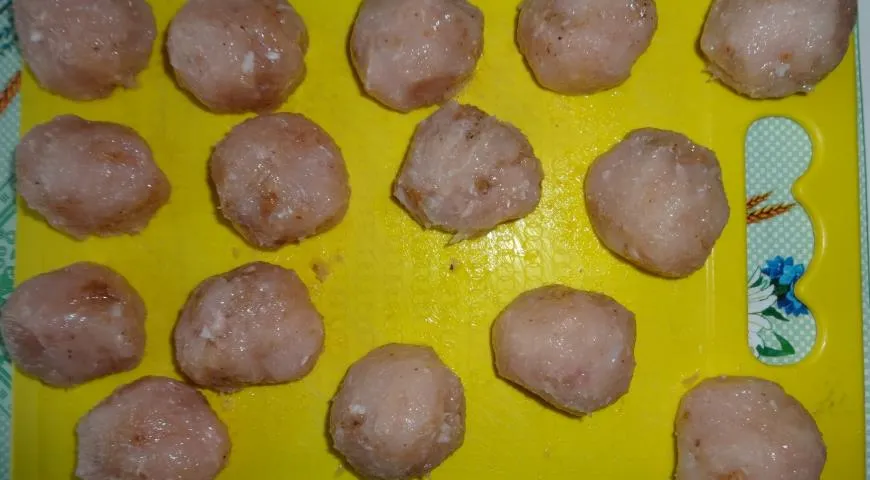 Из фарша сформовать фрикадельки диаметром примерно 2.5 - 3 см. Обвалять фрикадельки в муке.