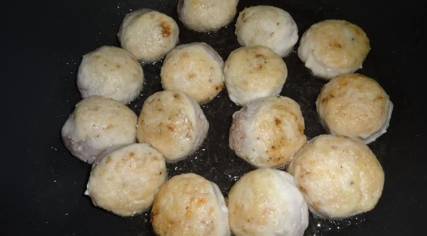 В сковороду налить масла, разогреть и обжарить на нём фрикадельки со всех сторон до золотистого цвета. Выложить фрикадельки в тарелку.
