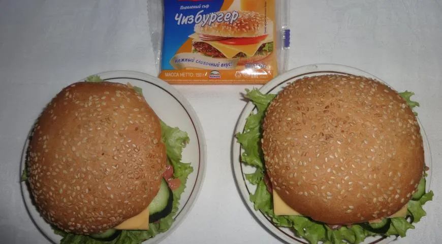 На сыр выложить вторую половину булочки. Таким же образом сделать второй бургер. выложить бургеры на тарелку и подать к столу.