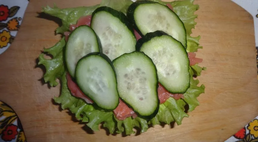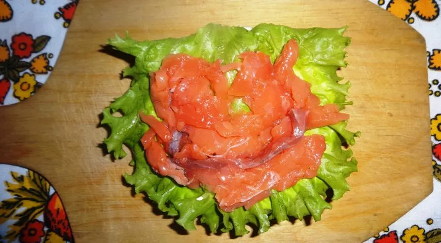 Слой сметаны накрыть листом салата. На салат выложить половину солёной рыбы.