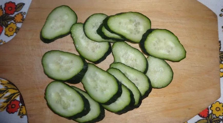 Огурец вымыть, обсушить, нарезать тонкими овалами.