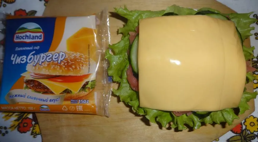 На слой огурцов выложить пластину плавленого сыра "Чизбургер" Hochland.