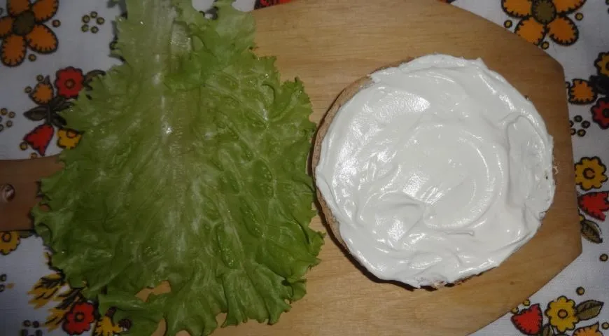 Булочки для бургеров разрезать вдоль пополам. Нижнюю часть булочки намазать 2 ст. л. сметаны.