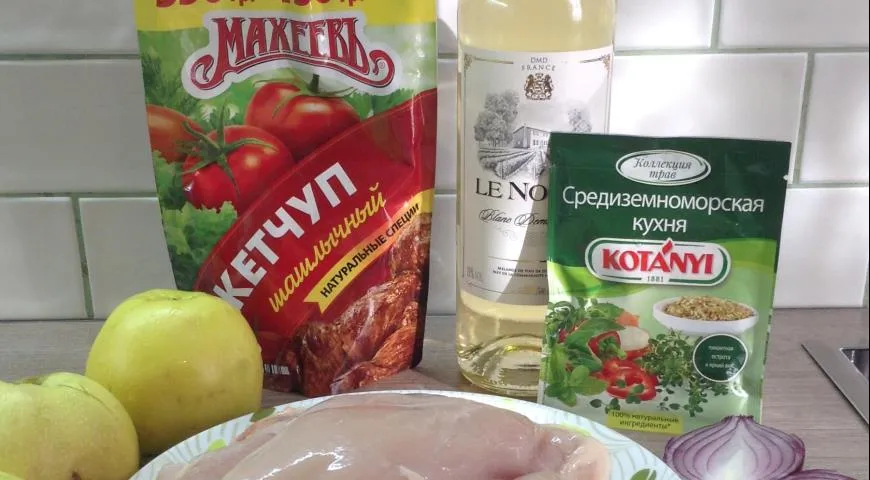 Куриную грудку солим, заливаем кетчупом Махеев и оставляем на пару часов.
