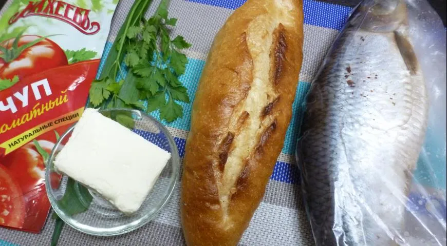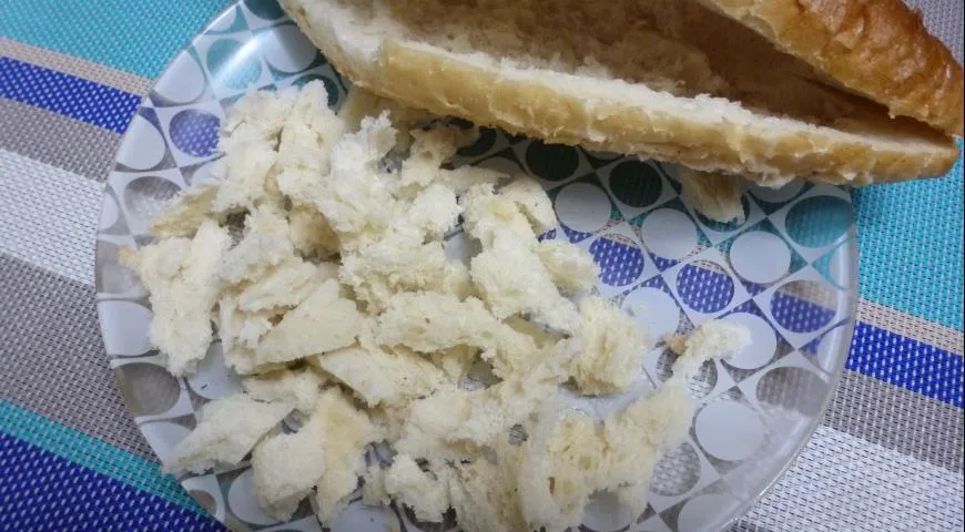 Батон разрезать вдоль, не прорезая другую сторону. Выбрать мякиш из батона. Раскрошить его помельче.