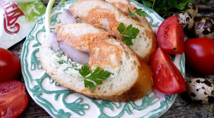Заполнить батон с одной стороны зеленым маслом, а с другой стороны красным маслом. В середину (между двумя видами масла) положить филе сельди. Плотно соединить половинки батона, завернуть в плёнку и отправить в холодильник на 2-3 часа, а в идеале на ночь. Нарезать батон на кусочки и подать на стол. Приятного аппетита!