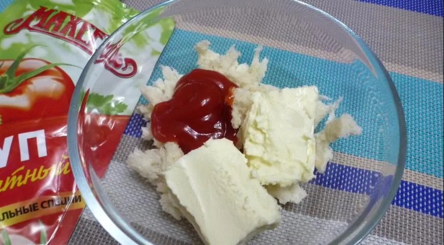 Вторую часть крошек смешать с оставшимся сливочным маслом и кетчупом ТМ Махеевъ томатный. Приправить перцем.