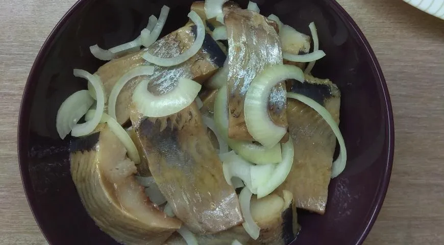 Разделываем селёдку, нарезаем лук полукольцами и выкладываем слоями