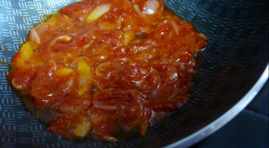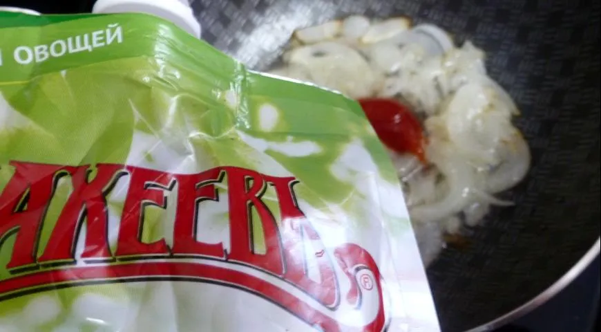 Добавить в сковороду к луку кетчуп ТМ Махеев.