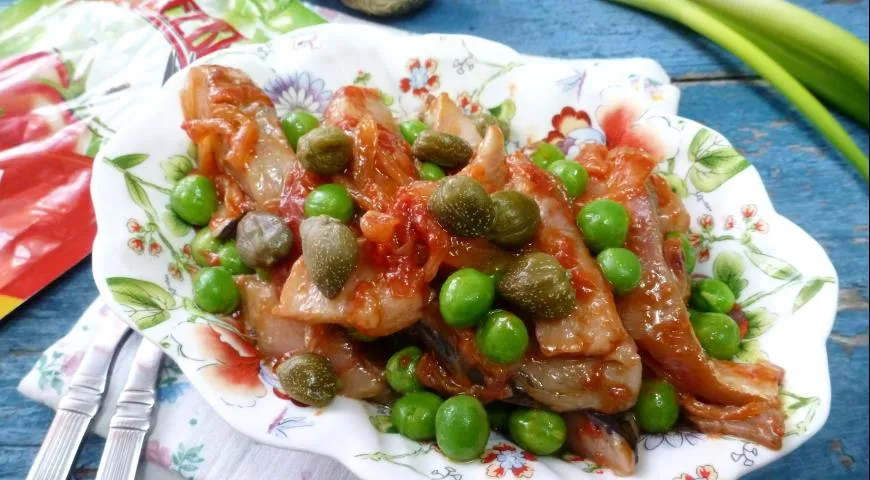 Соленую сельдь почистить и разделать на филе, нарезать тонкими кусочками. Добавить к кусочкам селедки обжаренный лук с кетчупом, аккуратно перемешать. Дать настояться 3-4 часа, а лучше оставить на ночь. При подаче в салат добавить зеленый горошек,каперсы и аккуратно перемешать. Зеленый горошек (замороженный) проварить 2 минуты и охладить холодной водой, чтобы горошек остался зеленым. Можно подать как закусочный салат. Можно приготовить с такой селедкой бутерброды.