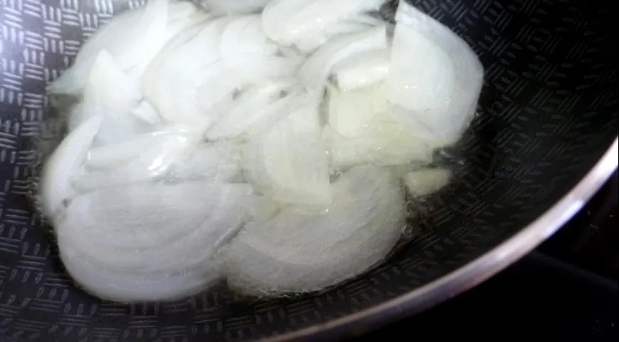 Лук нарезать полукольцами и обжарить на растительном масле до золотистого цвета. Обжаренный лук придаст селедке приятный "подкопченный" привкус и аромат.