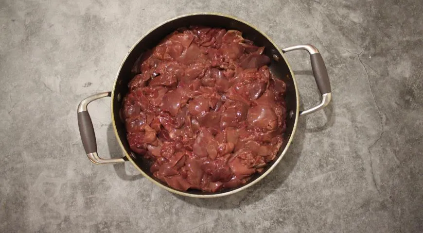 Куриную печень разрезать на 2-3 части, переложить в глубокую сковороду и в течение 15-20 минут потушить на среднем огне.