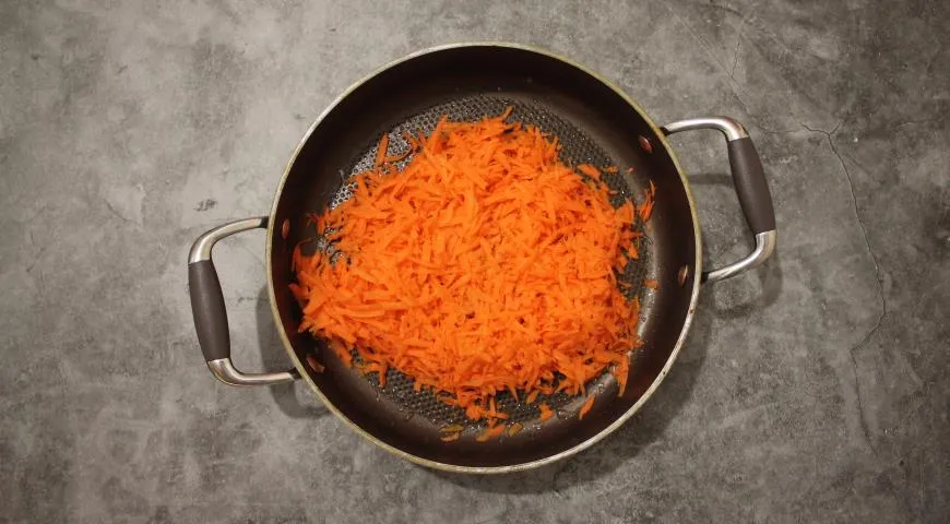 Морковь натереть на крупной терке и тоже слегка обжарить.