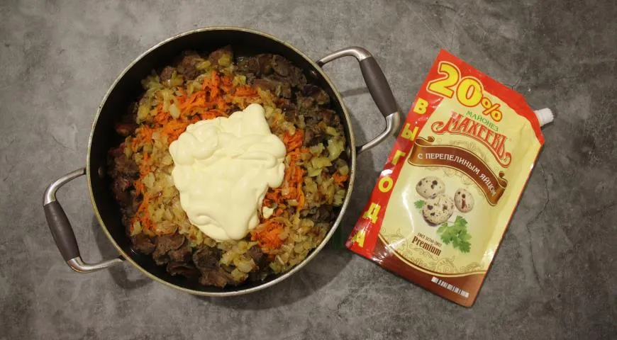 К печени добавить обжаренные лук и морковь, майонез, перемешать, влить немного кипятка и поставить тушиться.