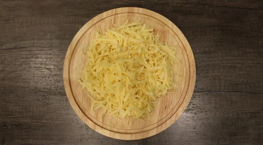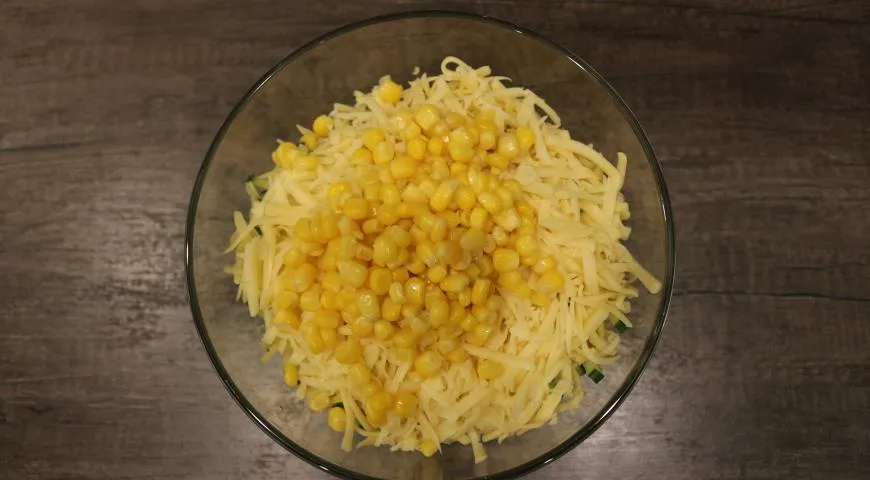 Сыр трем на крупной терке. Сырную стружку также выкладываем к другим ингредиентам салата.