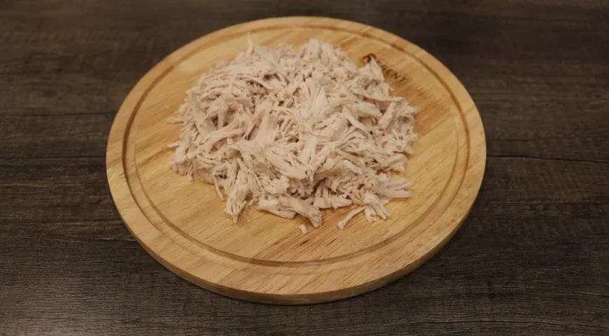 Филе куры моем, затем кладем в кастрюлю с водой, ставим на огонь, доводим до кипения, после чего уменьшаем огонь до минимального, накрываем кастрюлю крышкой и варим мясо птицы до готовности немного подсолив воду. Затем вынимаем куру из кастрюли и остужаем. После чего нарезаем на кусочки и кладем в глубокую емкость.