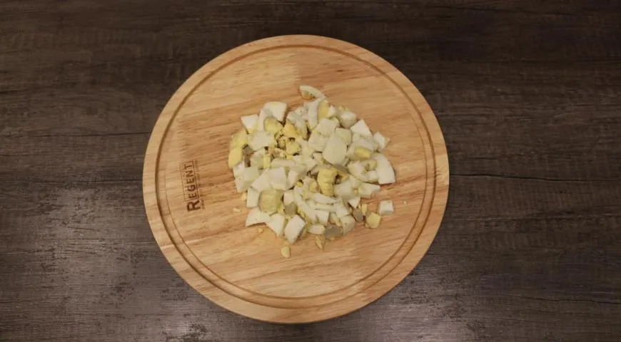 Заранее отвариваем яйца вкрутую. Когда они остынут, очищаем их от скорлупы и нарезаем кусочки среднего размера. Нарезанное яйцо выкладываем в емкость, где потом будем вымешивать салат.