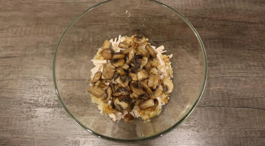 Лук чистим и мелко нарезаем и слегка обжариваем. Грибы моем и нарезаем на кусочки среднего размера. Обжариваем их на сковороде. Обжаренные грибы и лук выкладываем в емкость к курице.