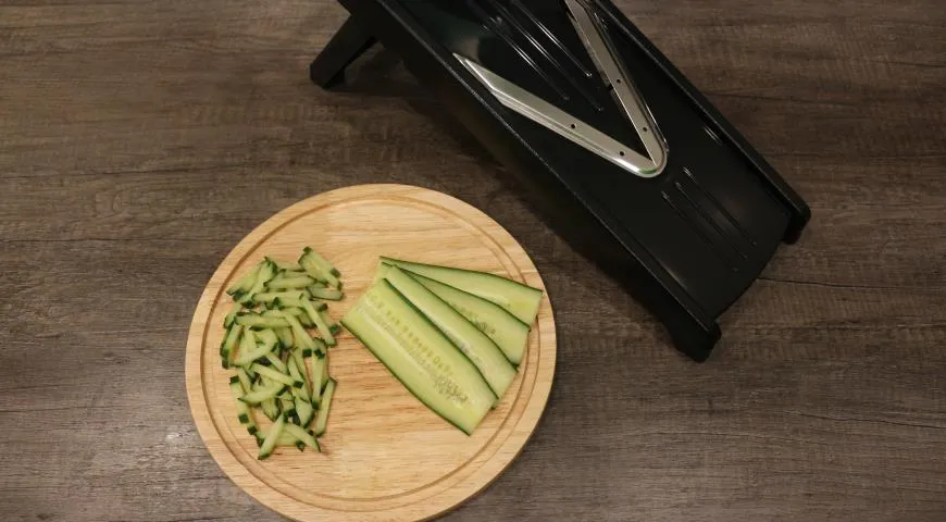 Огурец моем и нарезаем длинными слайсами, затем короткой соломкой. Огуречную соломку добавляем к уже подготовленным ингредиентам.