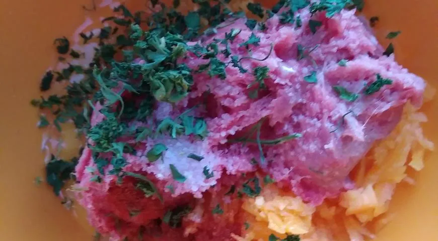В миске смешать фарш,натёртую тыкву,яйцо,посолить,поперчить,все перемешать.