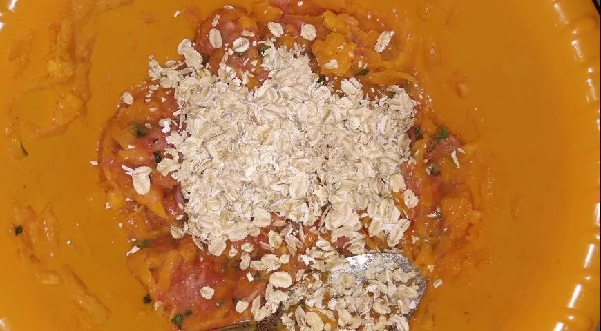 Добавить овсяные хлопья,кетчуп,перемешать.