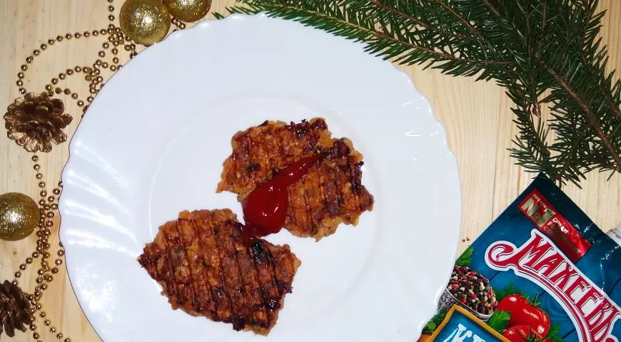 Сформировать котлеты и готовить в мультипекаре в режиме гриль до готовности. Подавать с кетчупом перечный микс от Махеев.