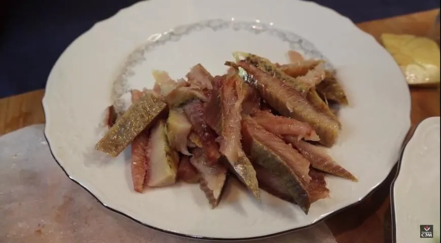 Снять с сельди филе, тщательно проверить на наличие мелких костей, постараться максимально избавить от них филе. Нарезаем филе небольшими кусочками и укладываем в блюдо.