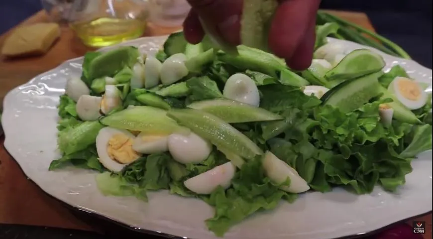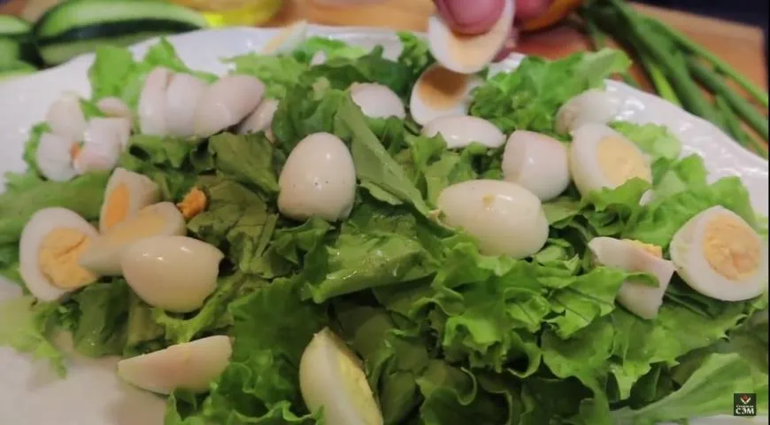 В блюдо для приготовления укладываем листья салата, предварительно отделив толстые стебли, а лист - порвать руками на средний размер. Отварить и почистить перепелиные яйца, разделить из пополам, уложить поверх салатных листьев.