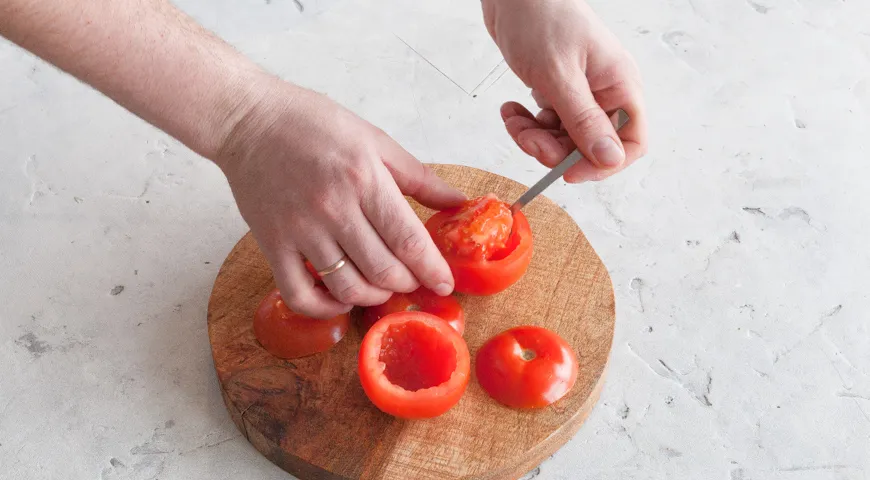 Срежьте и отложите верхушки помидоров. Чайной ложкой выньте мякоть, стараясь не повредить стенки помидора. Помидоры слегка посолите и поперчите, мякоть мелко порубите.
