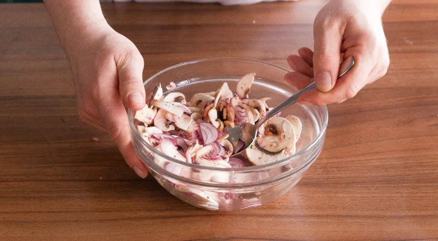 Протрите шампиньоны влажным бумажным полотенцем и нарежьте тонкими ломтиками. Лук нарежьте тонкими перьями. Лук и шампиньоны слегка посолите, посыпьте перцем, сбрызните лимонным соком и оставьте на 5-10 минут.