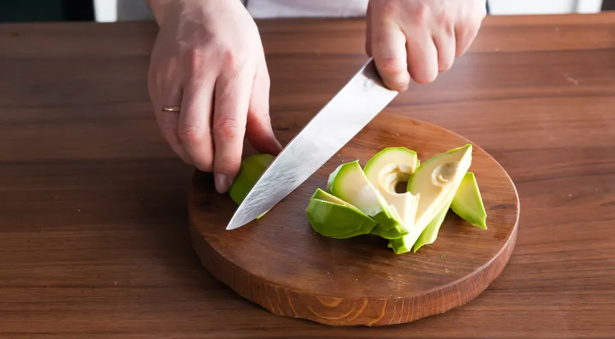 Авокадо разрежьте вдоль пополам, удалите косточку, очистите кожуру. Мякоть нарежьте ломтиками.