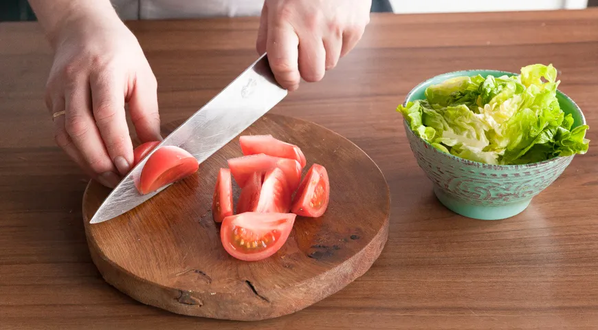 Помидоры нарежьте дольками. Листья салата нарвите руками на небольшие кусочки.