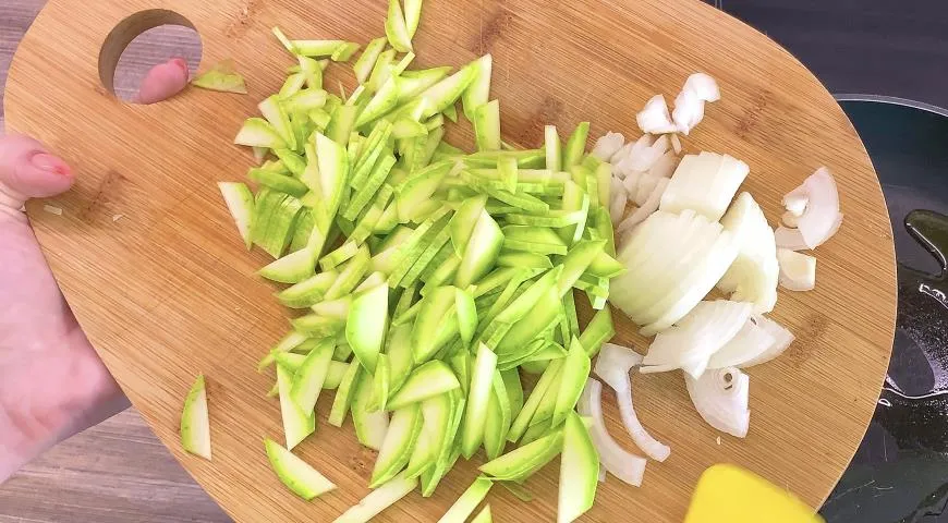 Мелко нарезать лук полукольцами, кабачок соломкой, сыр подтереть на терке.