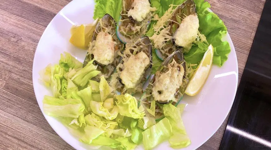 Достаём мидии из духовки и укладываем порционно по 5 штук, поливаем соком лимона и подаём.