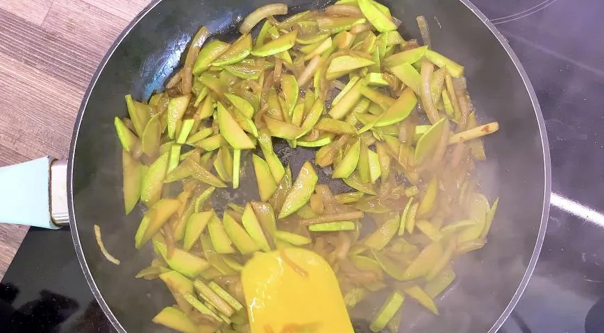 На сильном огне на растительном масле обжарить овощи.