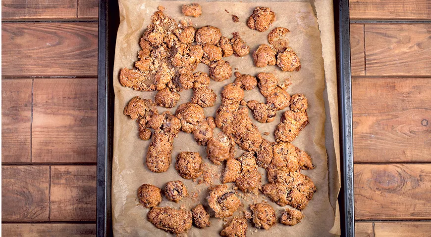Приготовьте засахаренные орехи. Разогрейте духовку до 125 °С и застелите противень пергаментом. Взбейте яичный белок с водой до образования пены. В отдельной миске смешайте белый и коричневый сахар, соль и корицу.