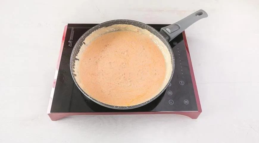Очистите лук и нарежьте маленькими кубиками. Добавьте в сковороду топленого масла и обжарьте лук до мягкости на среднем огне, 5–7 мин. Затем добавьте приправу «Курица-гриль» с копченой паприкой и муку и жарьте, помешивая, 2 мин. Влейте 100 мл воды и добавьте сметану, хорошо перемешайте, чтобы не было комочков. Посолите и поперчите.
